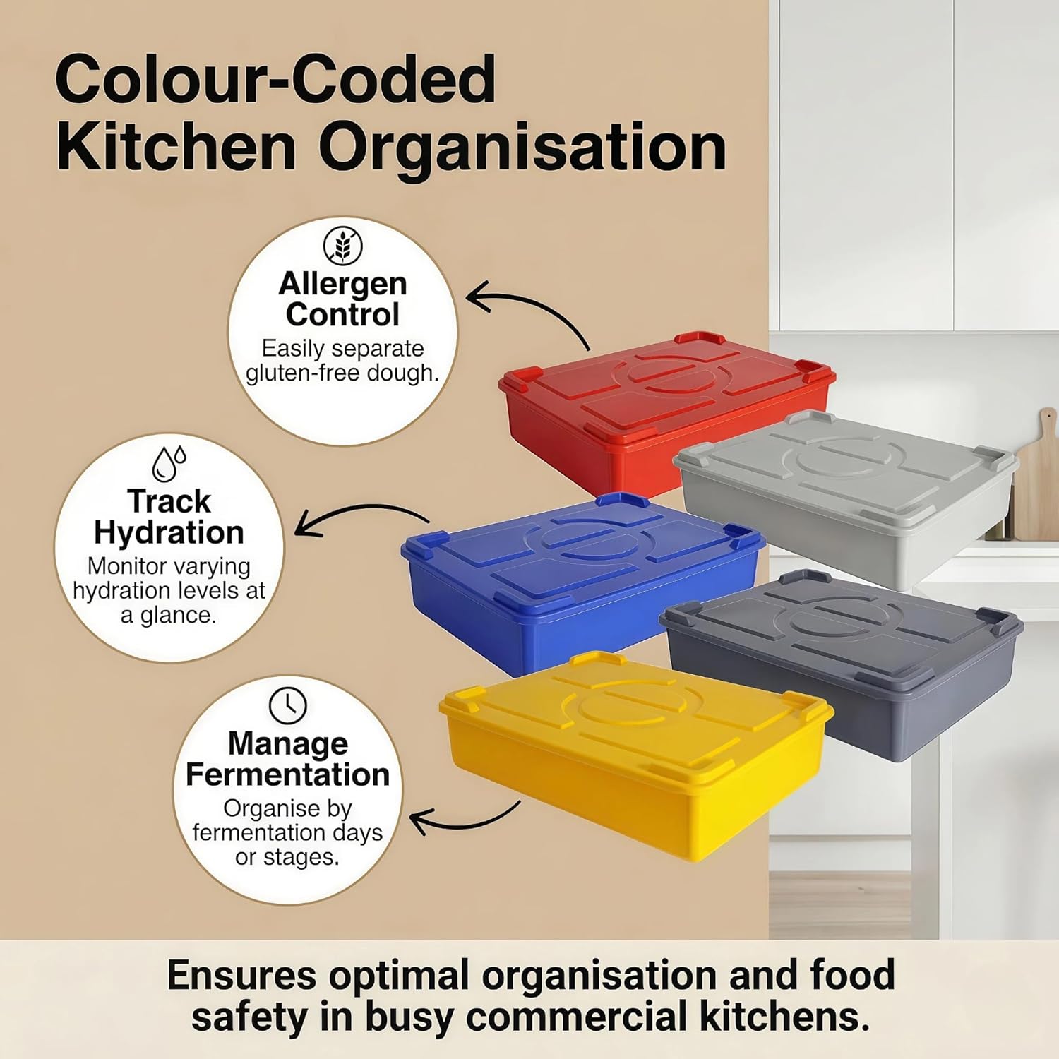 - Available in multiple distinct colours, these dough containers allow for easy colour-coding in busy commercial kitchens. Use different colours to quickly separate gluten-free dough, track hydration levels, or manage fermentation days, ensuring optimal organization and food safety.