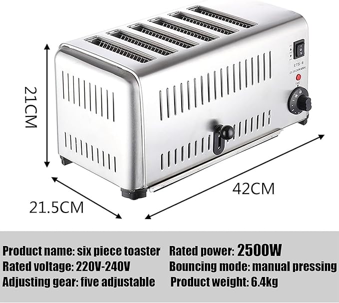 Make your mornings easier with this 6 slice commercial toaster. The extra wide slots accommodate a variety of sizes and the 5 speed settings ensure perfect toasting every time. With 2400W of power, this electric toaster is efficient and fast. The sleek silver design adds a modern touch to any kitchen. This model, ETS-6, comes with a 1 year manufacturer warranty. Perfect for busy households or small cafes, this toaster is a must-have for any kitchen.