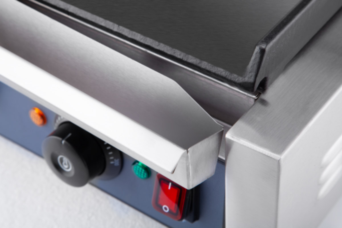The Ace Double Panini Grill with top ribbed and bottom flat has cast iron plates for long-term use and healthier grilling and is ideal for cooking burgers, steaks, paninis and toasted sandwiches in busy establishments. With an adjustable swivel head and a variable heat knob for different thicknesses and temperatures, you have complete control over the entire grilling process. It is also supplied with a removable grease tray and griddle scraper for easier cleaning.