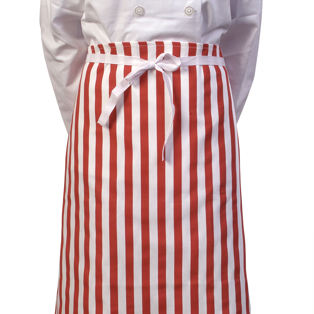 Durable and hardwearing easycare waist apron. Standard length, featuring a red stripe design.