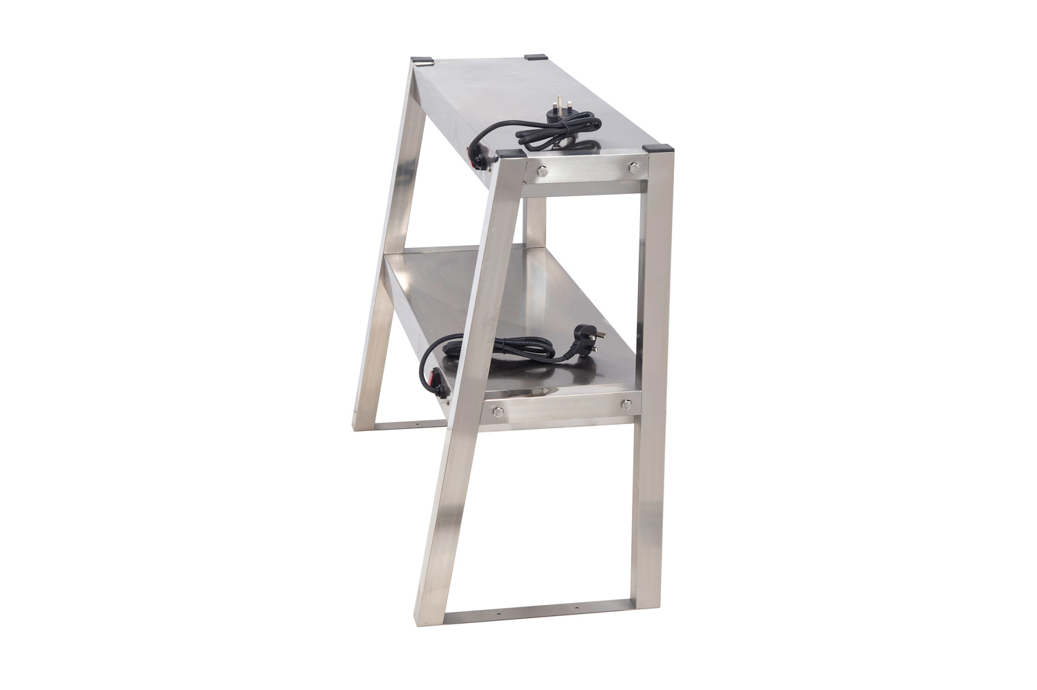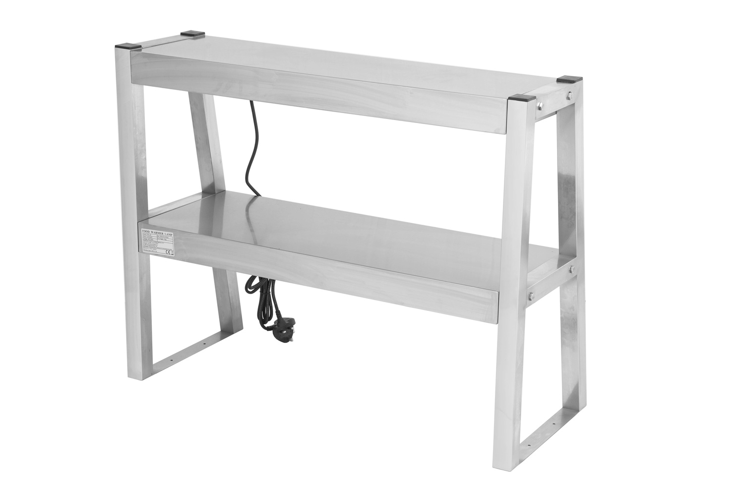 HOSTY Double Tier Heated Gantry with Dimmer W900mm X D370 X H700 Robust over-shelving with Quartz lamp heating. Strong fully welded stainless steel construction. Each tier has a separate switch for individual control. 430 grade 1.2mm stainless shelf unit. Box section frame cut lamp holder panel.