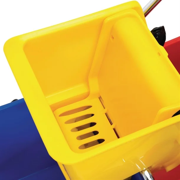 The dual bucket and mop wringer is a durable polypropylene mopping system, allowing you to use one bucket for clean and one for dirty water, helping you achieve best cleaning results. The mop wringer strains mops of liquid, making cleaning floors more efficient, ideal for use in busy cafes, restaurants, bars and hotels.