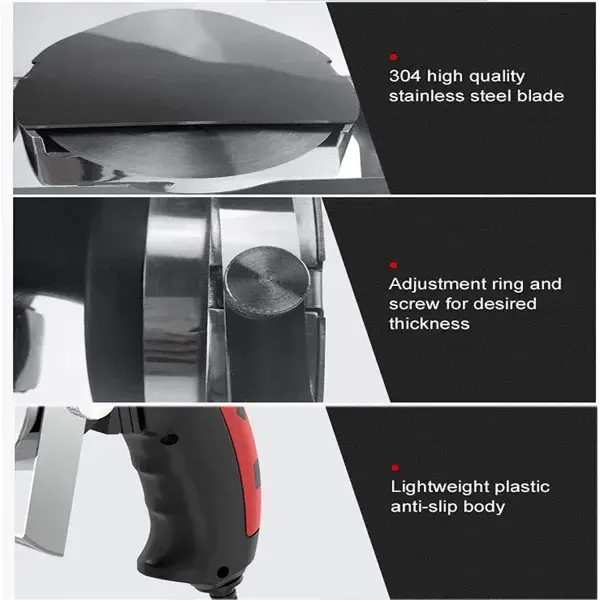 Powerful and Quiet  Ergonomically designed handheld Kebab Slicer, it is powerful, can cut meat pieces as thin as a piece of paper (0-8mm adjustable), and it wont make big noise as traditional kitchen tools.