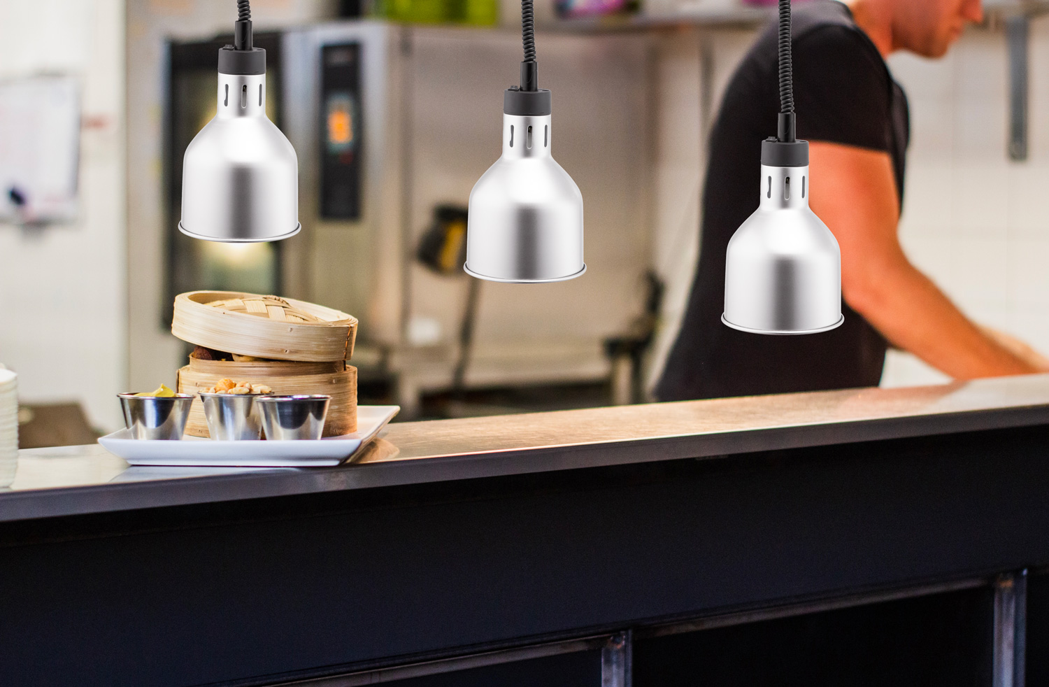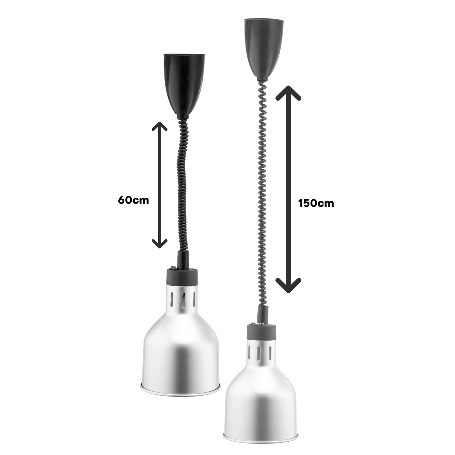 This ceiling mounted commercial heating lamp with retractable cord in silver is a reliable and stylish solution for hot holding food. Ideally suited for use on the pass or in self-service buffet areas, the lamp can easily be adjusted so that food is kept appealing and at the perfect serving temperature.