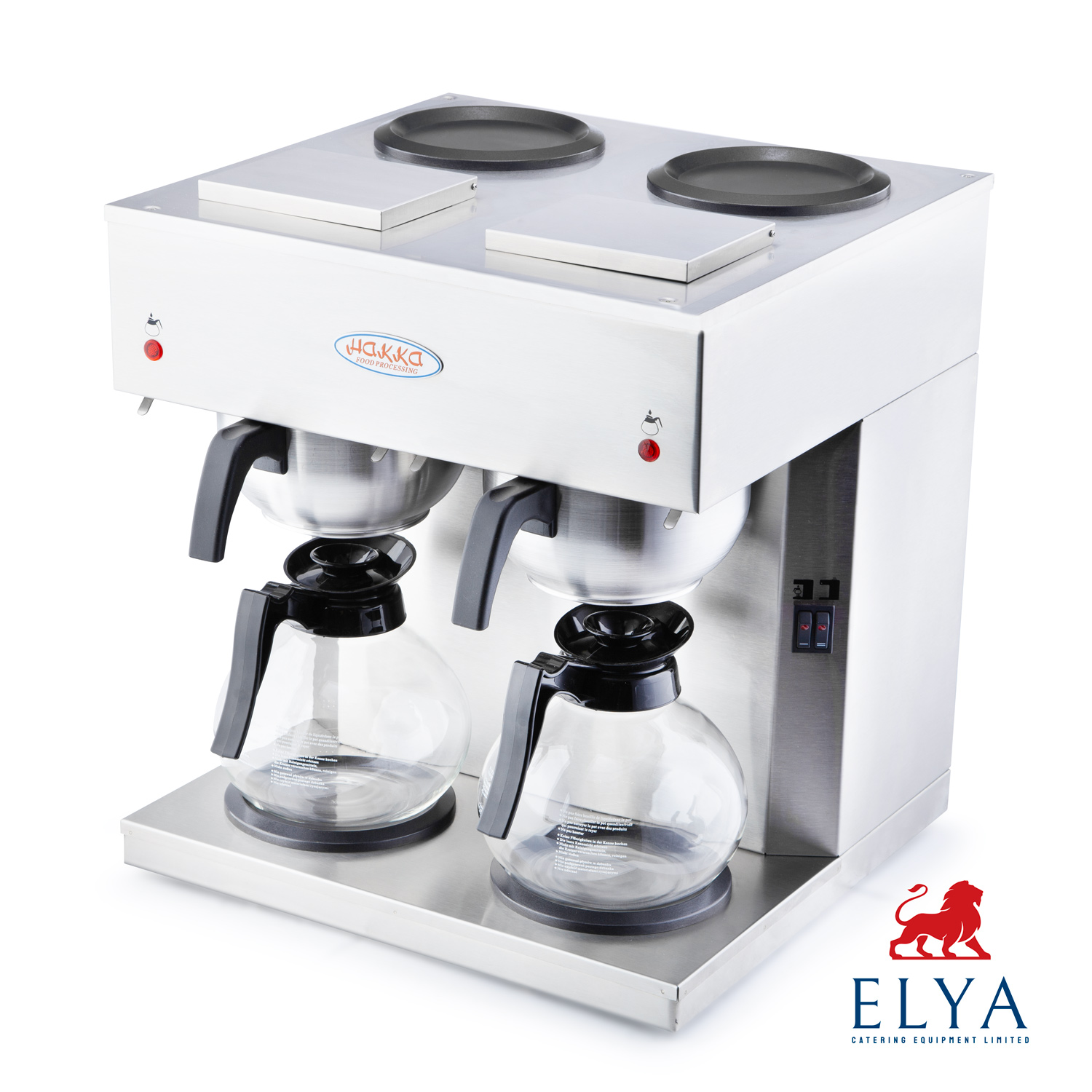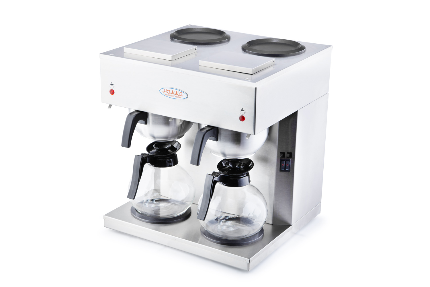 The HAKKA twin machine is a quick filter machine and is designed for locations without a water connection. This coffee machine comes with 4 hot plates and 2 brewing stations. It has a water indicator which tells the customer whether the machine has been filled or not. It also signals when the coffee is ready and also when it needs descaling to help maintenance of the machine.