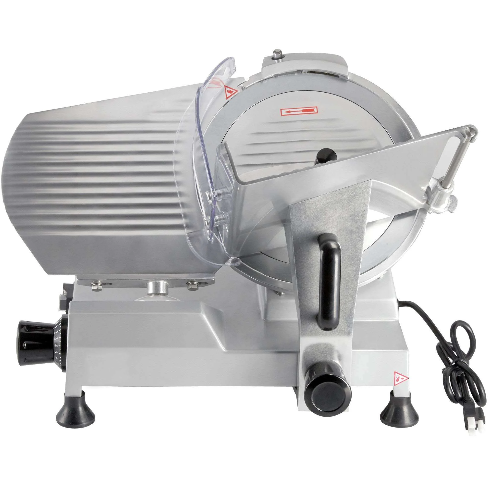 Graduated knob for adjusting thickness.Cutting Thickness:0-15mm. Premium Chromium-plated Carbon Steel Blade with protection against corrosion,Imported from Italy. Every slicer has a blade sharpener which will extend the service life of the blade. Slicing meat, cheese, bread, veggies, ham, fruit precisely; USA standard approved: ETL, NSF, FDA. Moving handle and the fixed device handle compose of dual handles system to slice meat effortlessly. Product Dimensions: 24.2″L x 21″W x 19.9″H Material: Aluminum, Carbon Steel Color: Silver Special Feature: Product Care Instructions: Hand Wash Only Blade Material: Carbon Steel Item Weight: 49.6 Pounds Blade Length: 300 Millimetres Blade Shape: Round