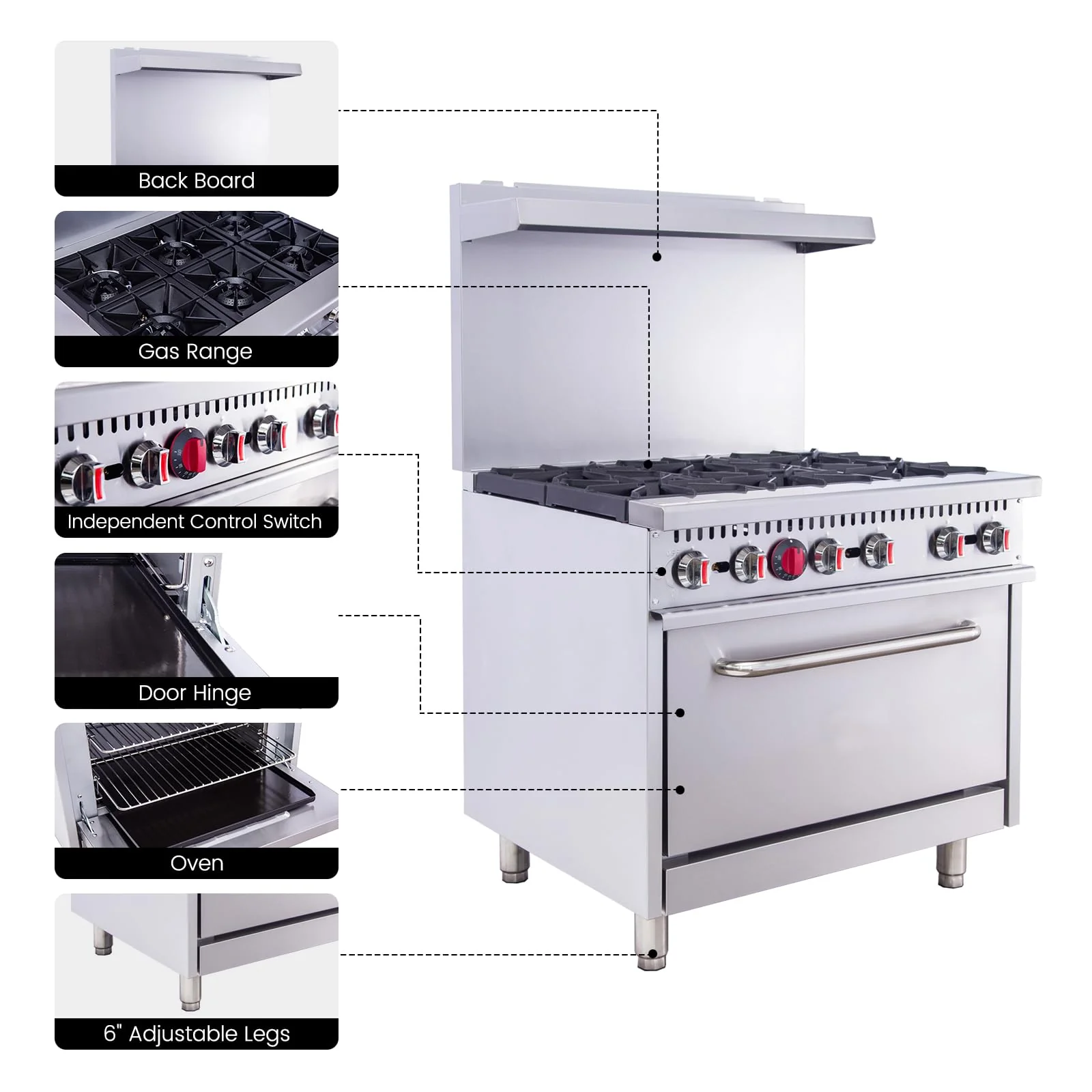 - Contains 6 cast iron burners with independent controls