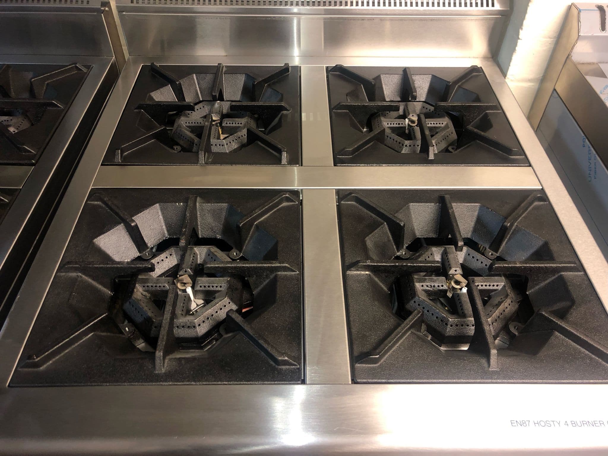 This brand new HOSTY 4 burner Natural gas cooker and stainless steel stand  is ideal for a restaurant or take away.