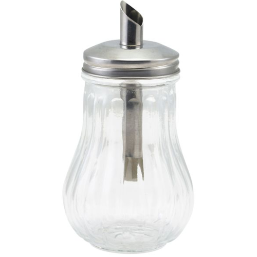 A retro style sugar pourer, ideal for coffee shops to serve sugar in. A glass body with a stainless steel screw top lid.