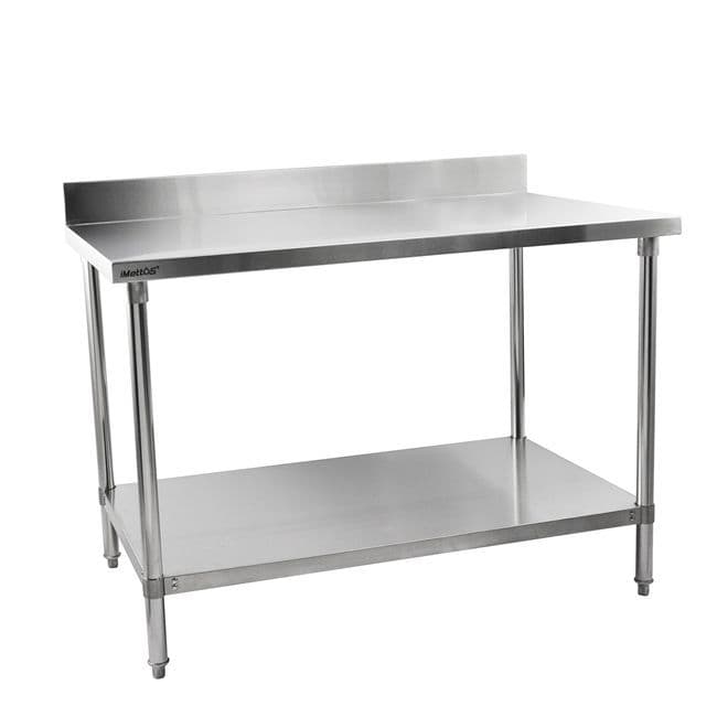 Stainless steel preparation table with splash made of 304 stainless steel. Come wiyh a shelf under for practical storage and also a up stand to stop equipment from rolling of the back onto the floor. Extremely easy to clean, the unit is perfect for use in any kitchen and food preparation areas.