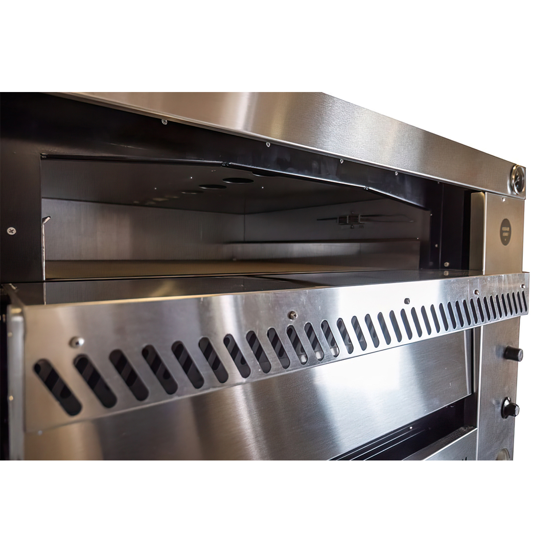Heat is generated by stainless steel armoured burners delivering a maximum cooking temperature of 400°C. The ovens are lit internally by high resistance halogen lamps and feature large counter balanced doors. The pizza oven is built to a high standard with the doors and fascia in stainless steel.
