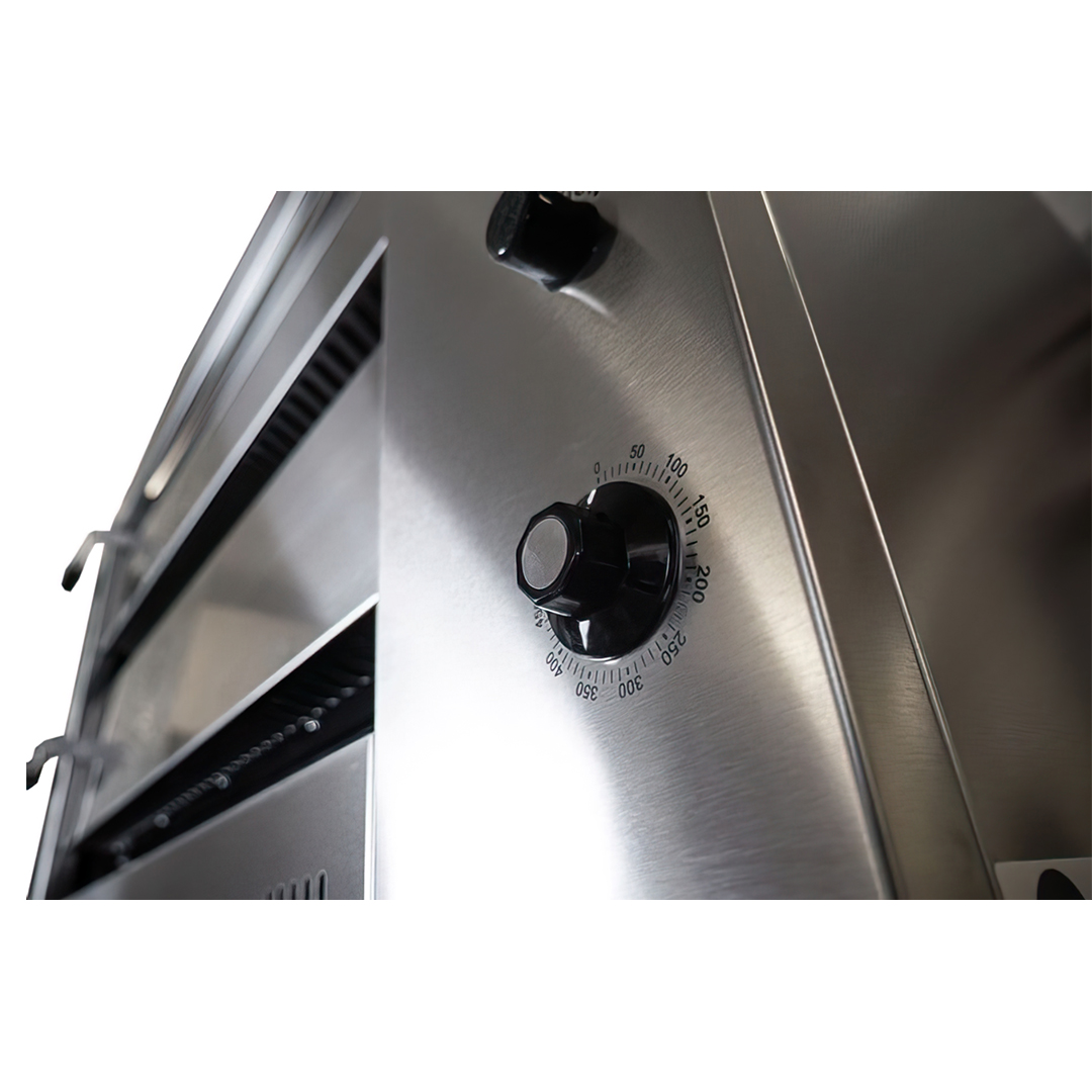 - Temperature is controlled by a high quality thermostat with a range of 0-400°C and is displayed by a thermometer on the control panel